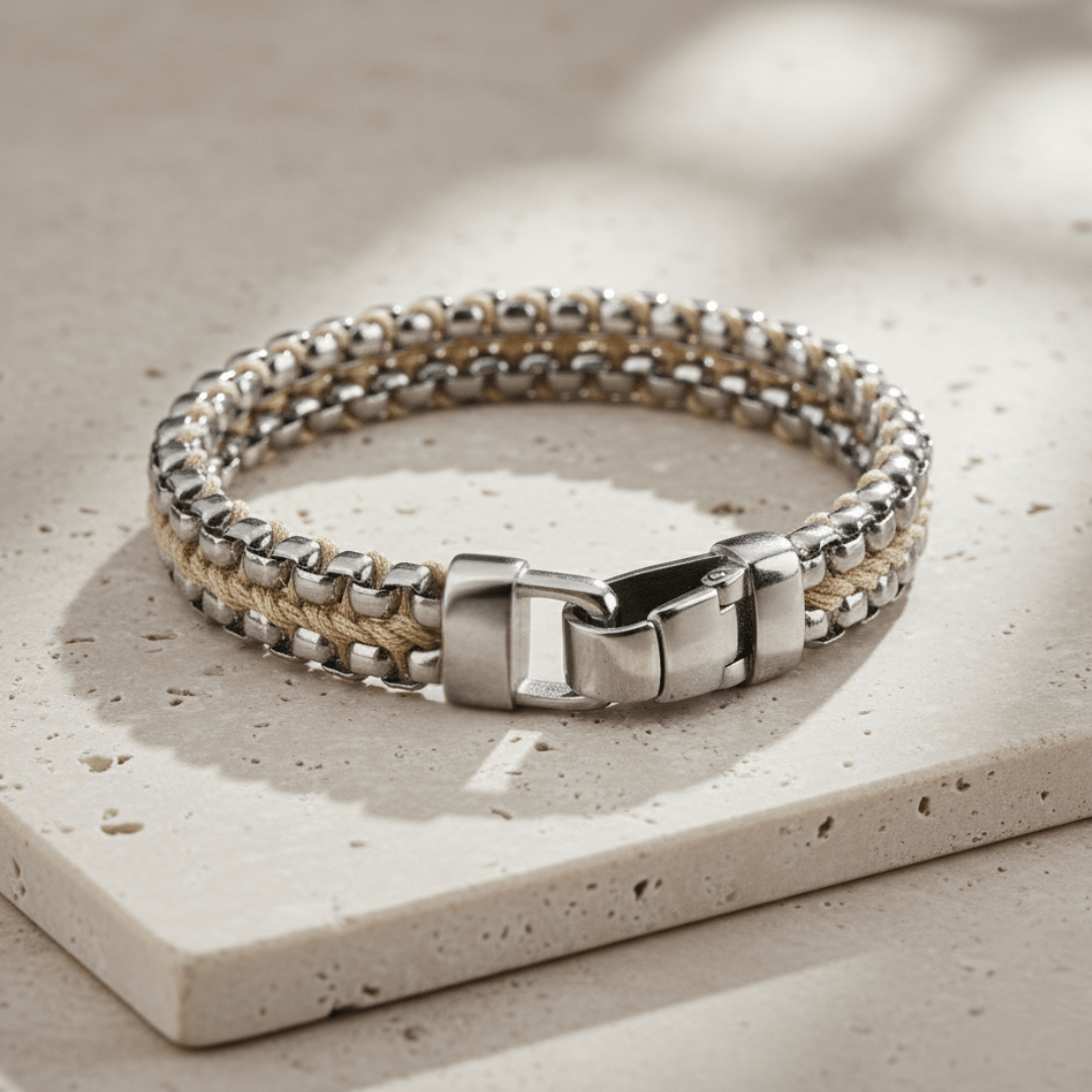 De Catena Fortissima is vervaardigd uit hoogwaardig maritiem roestvrij staal en versterkt nautisch touw, ontworpen om zowel duurzaam als elegant te zijn. De dubbele box chain-structuur straalt kracht uit, terwijl de Midnight- en Argentum-kleuren een subtiele luxe toevoegen. Met een lengte van 21,5 cm biedt deze armband een comfortabele pasvorm voor dagelijks gebruik.