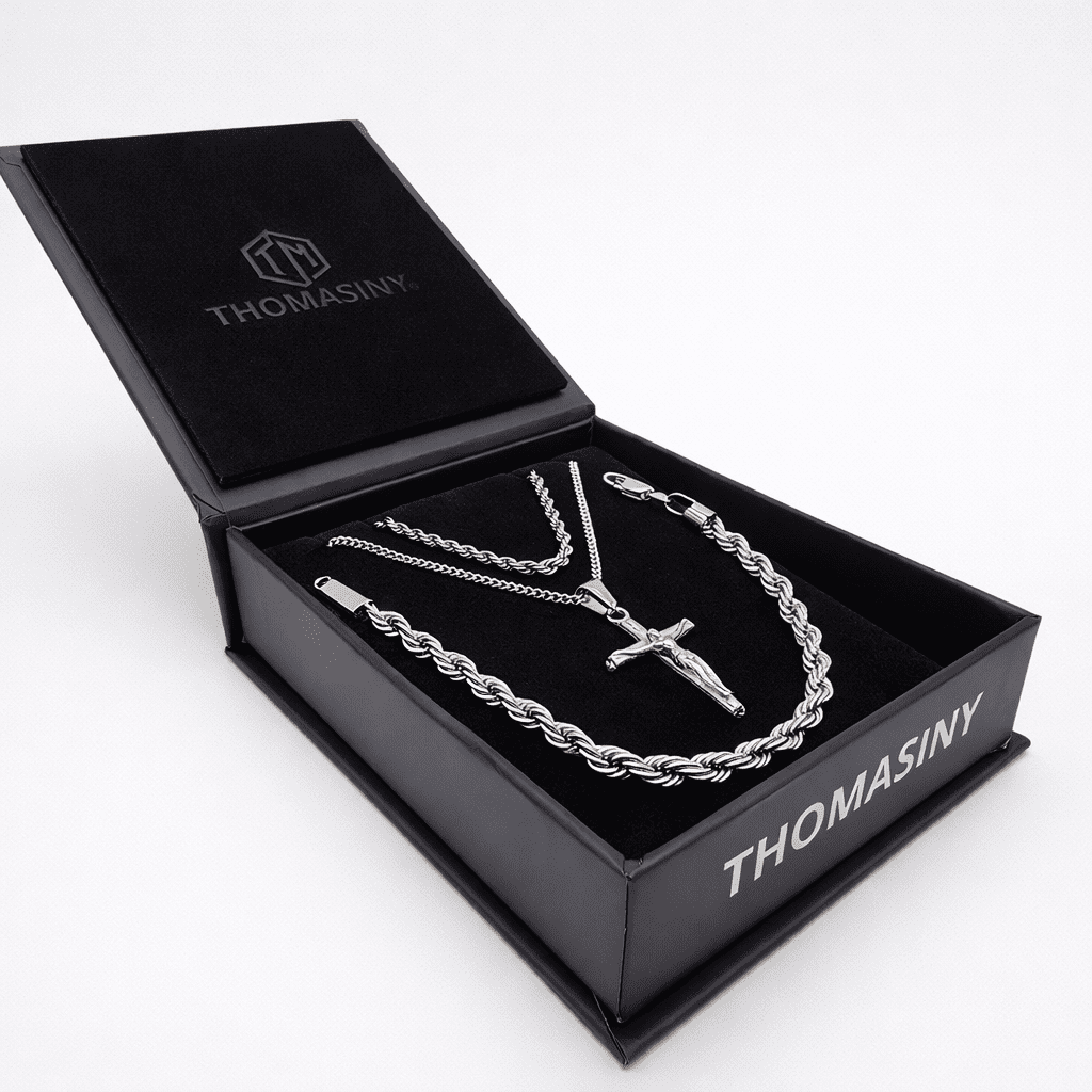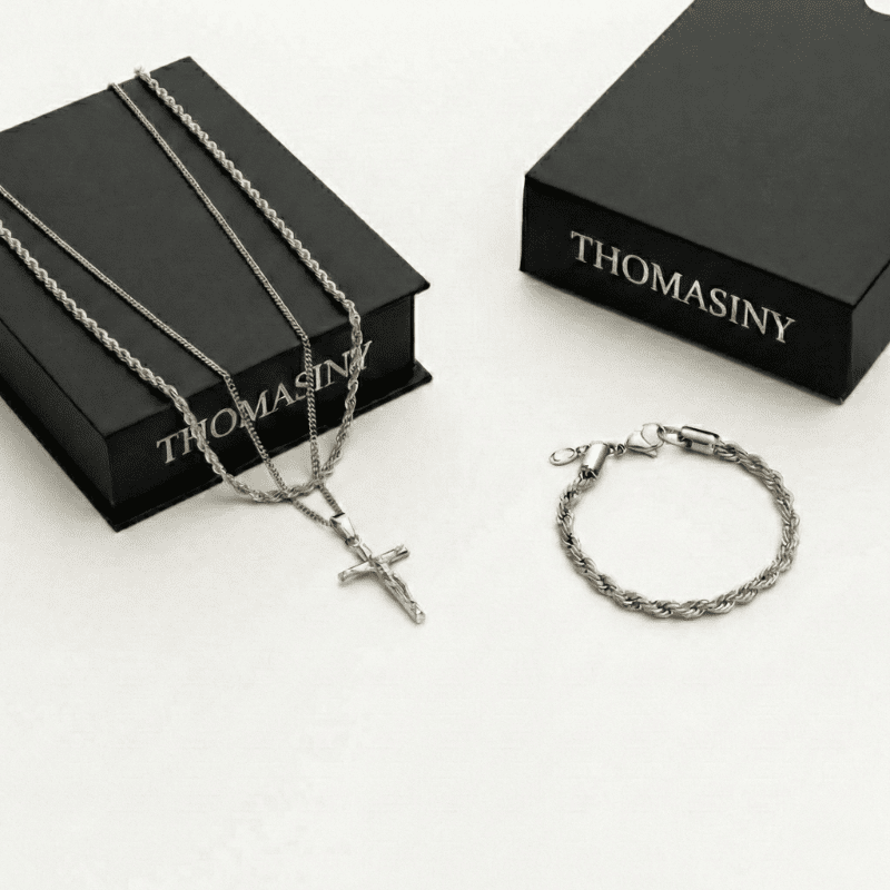Ontworpen voor mannen van alle leeftijden. Het kruis staat symbool voor innerlijke kracht, discipline en vastberadenheid. Een tijdloze set voor dagelijks gebruik en bijzondere momenten, ontworpen om jarenlang met trots te dragen.