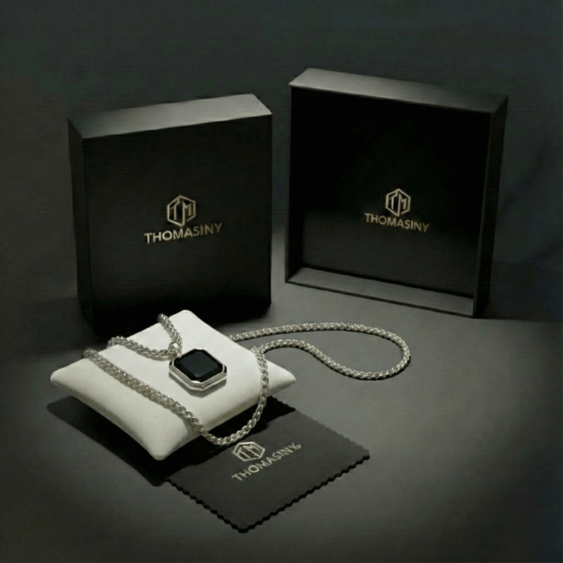 Je ontvangt één Thomasiny Black Vanta ketting met hanger, geleverd in een luxe Thomasiny geschenkverpakking.