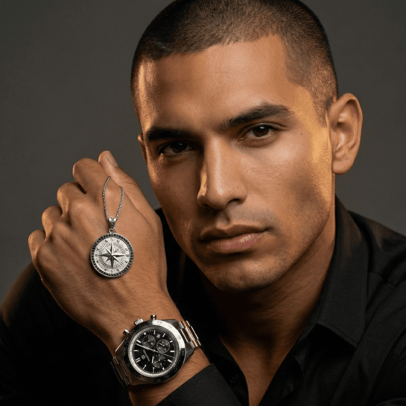 Subtiel ingelegde hoogwaardige stenen geven het ontwerp een verfijnde, luxueuze touch. Het kompas staat symbool voor focus, leiderschap en innerlijke richting — perfect voor de man die zijn eigen pad volgt.